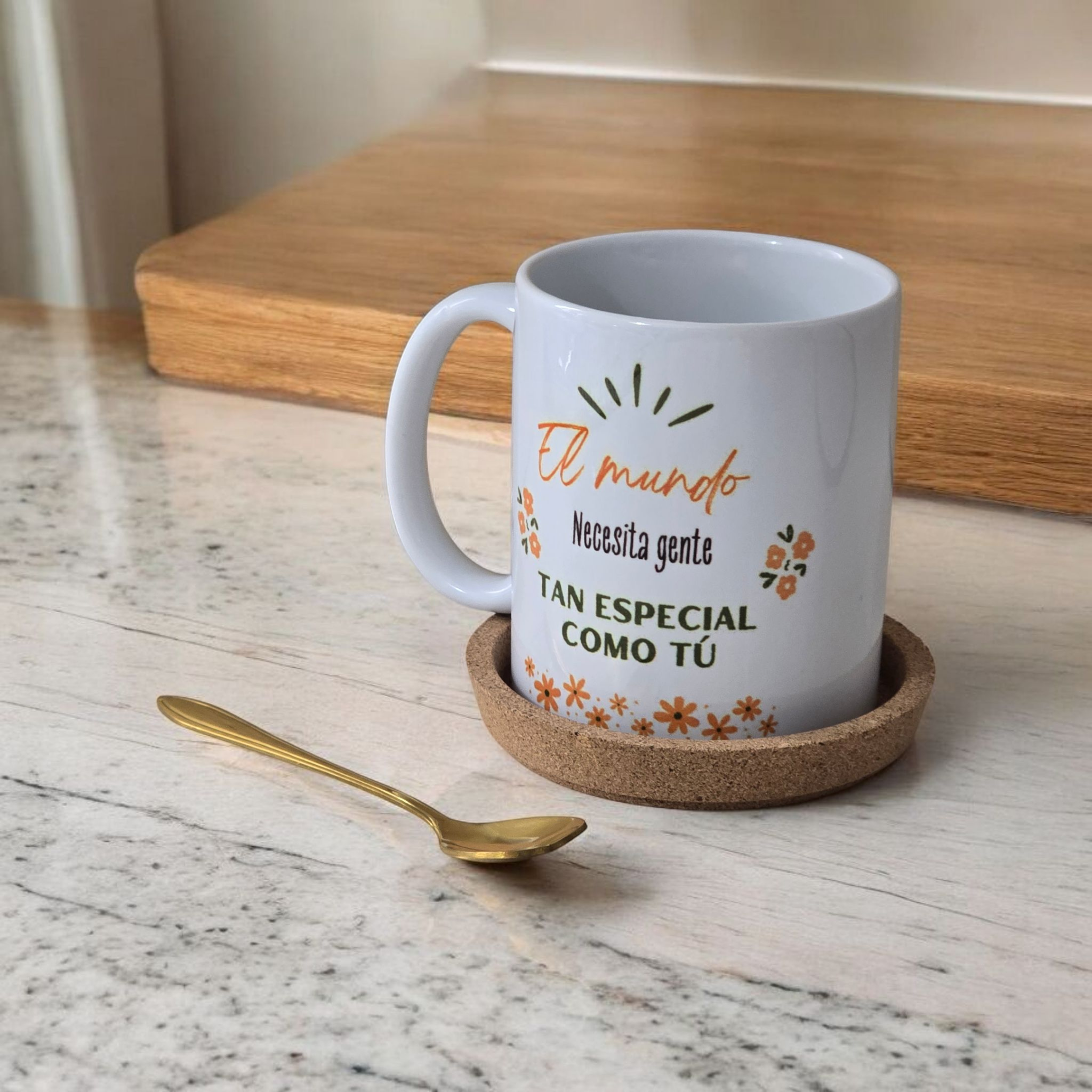 Ideal para empezar el día con buen rollo o para recordarle a alguien especial lo importante que es, esta taza no viene sola: incluye una cucharita a juego y un posavasos que convierte cada café o té en un momento con intención.